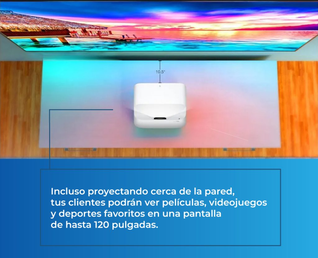 Uno de los principales diferenciales de estos proyectores es su capacidad de proyectar imágenes de gran tamaño aun ubicándose muy cerca de la pared. Esto permite disfrutar películas, videojuegos y deportes en una pantalla de hasta 120 pulgadas, sin necesidad de instalaciones complejas ni grandes distancias de proyección.
