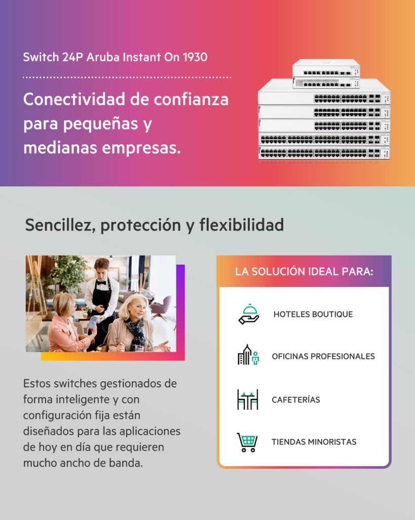 Los switches Aruba Instant On 1930 ofrecen el equilibrio perfecto entre rendimiento y facilidad de uso. Están diseñados para garantizar una conectividad estable y segura, incluso en entornos con alta demanda de ancho de banda.