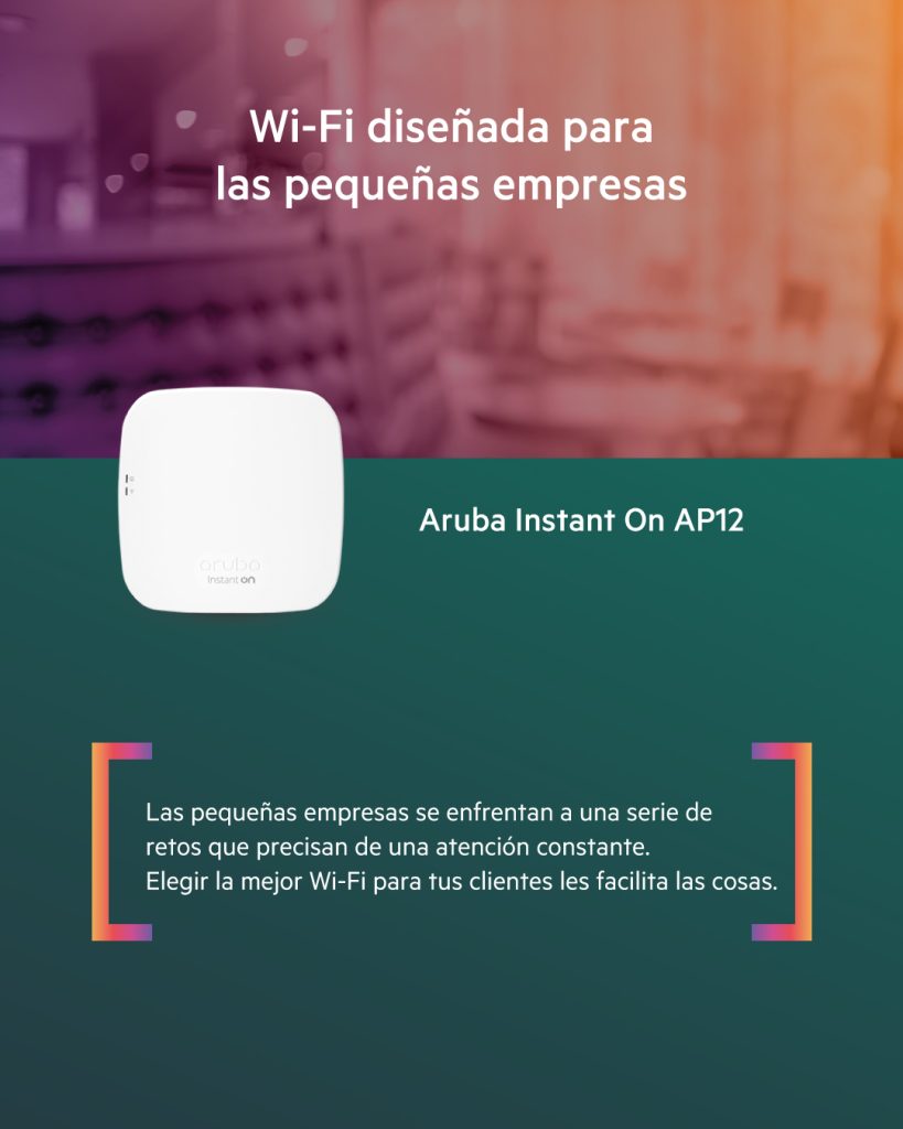 El Aruba Instant On AP12 proporciona una conexión Wi-Fi estable, segura y fácil de administrar. Está pensado para pequeños negocios que necesitan mantener conectados tanto a su equipo como a sus clientes, ofreciendo una experiencia de red sin interrupciones.