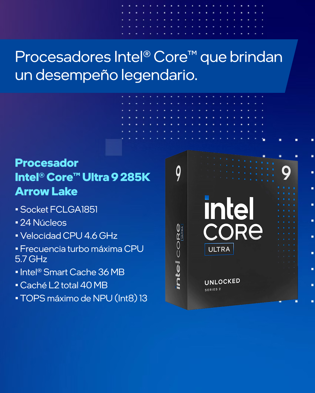 La nueva generación de Intel Ultra eleva el estándar del rendimiento. El Intel Core Ultra 9 285K lidera la familia con: