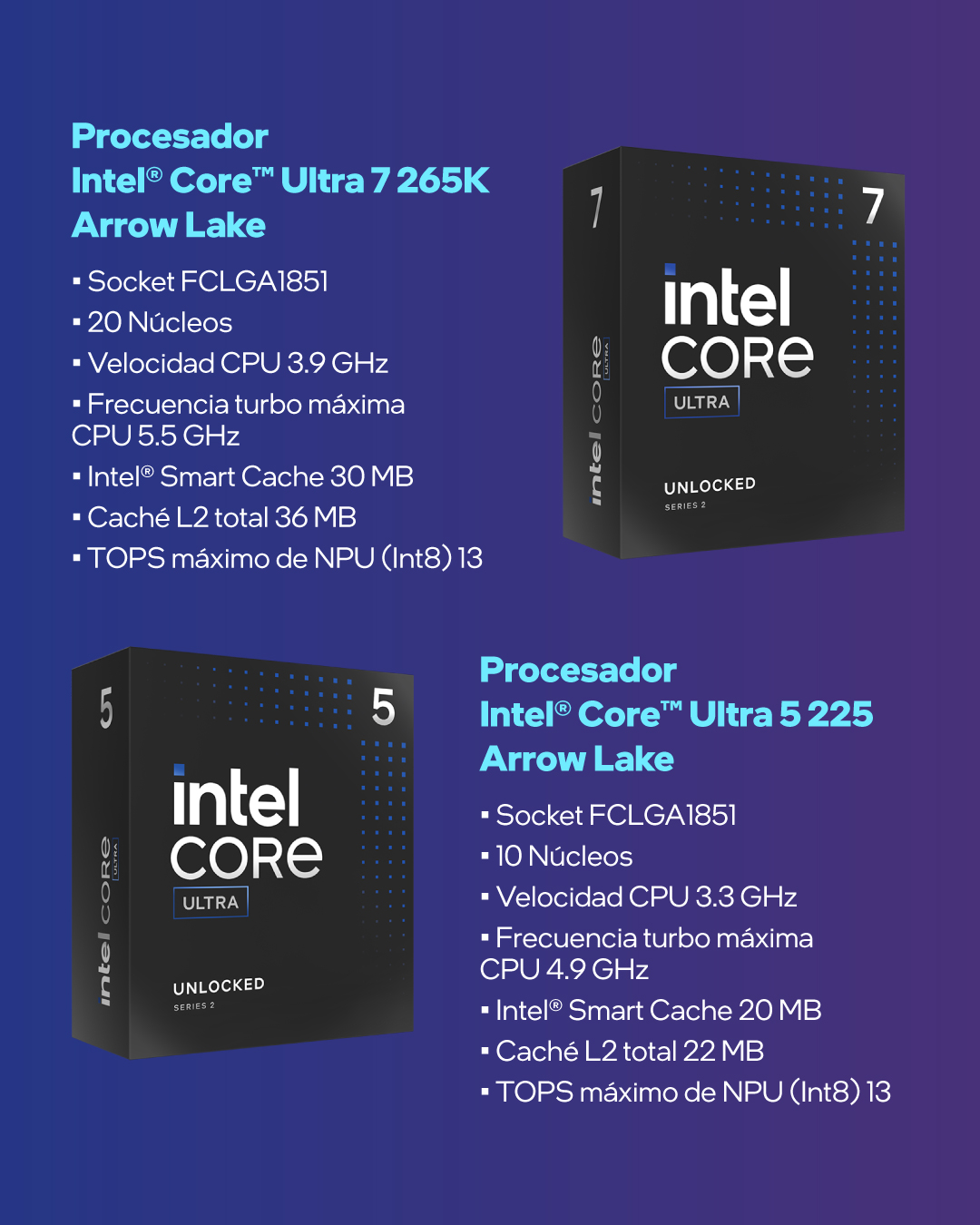 Las variantes Ultra 7 265K y Ultra 5 225 completan el portafolio con configuraciones equilibradas y eficientes, permitiendo cubrir diferentes necesidades de clientes sin comprometer la calidad.